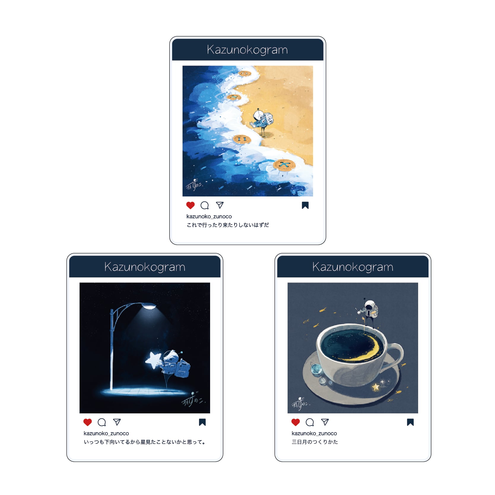 かずのこの持ち味である言葉遊びあるタイトルとイラストを一緒に楽しめる、SNS投稿風にデザインされたクリアカード3点セット。